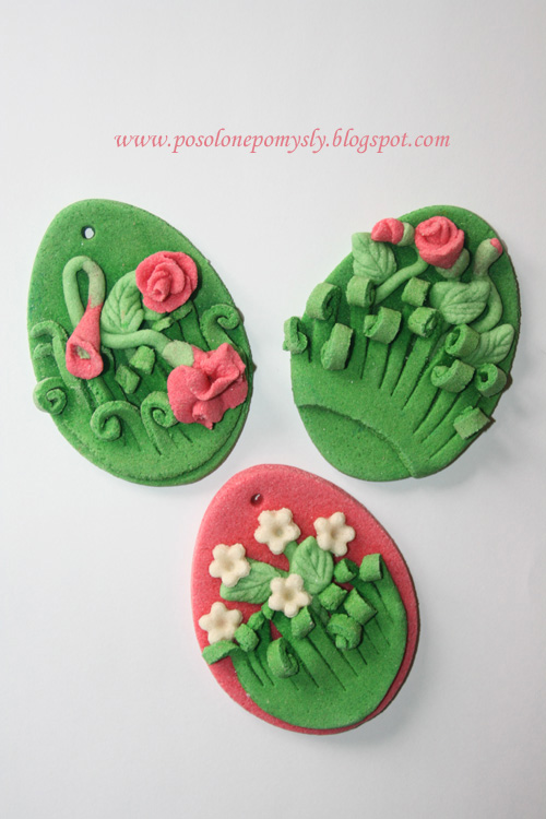 Ostatnio lepiłam serwetniki i świeczniki z farbowanej masy. Zostało mi trochę w ślicznych kolorach, wykorzystałam ją do zrobienia kilku solnych pisanek. Zainspirowałam się jajem, które widziałam u